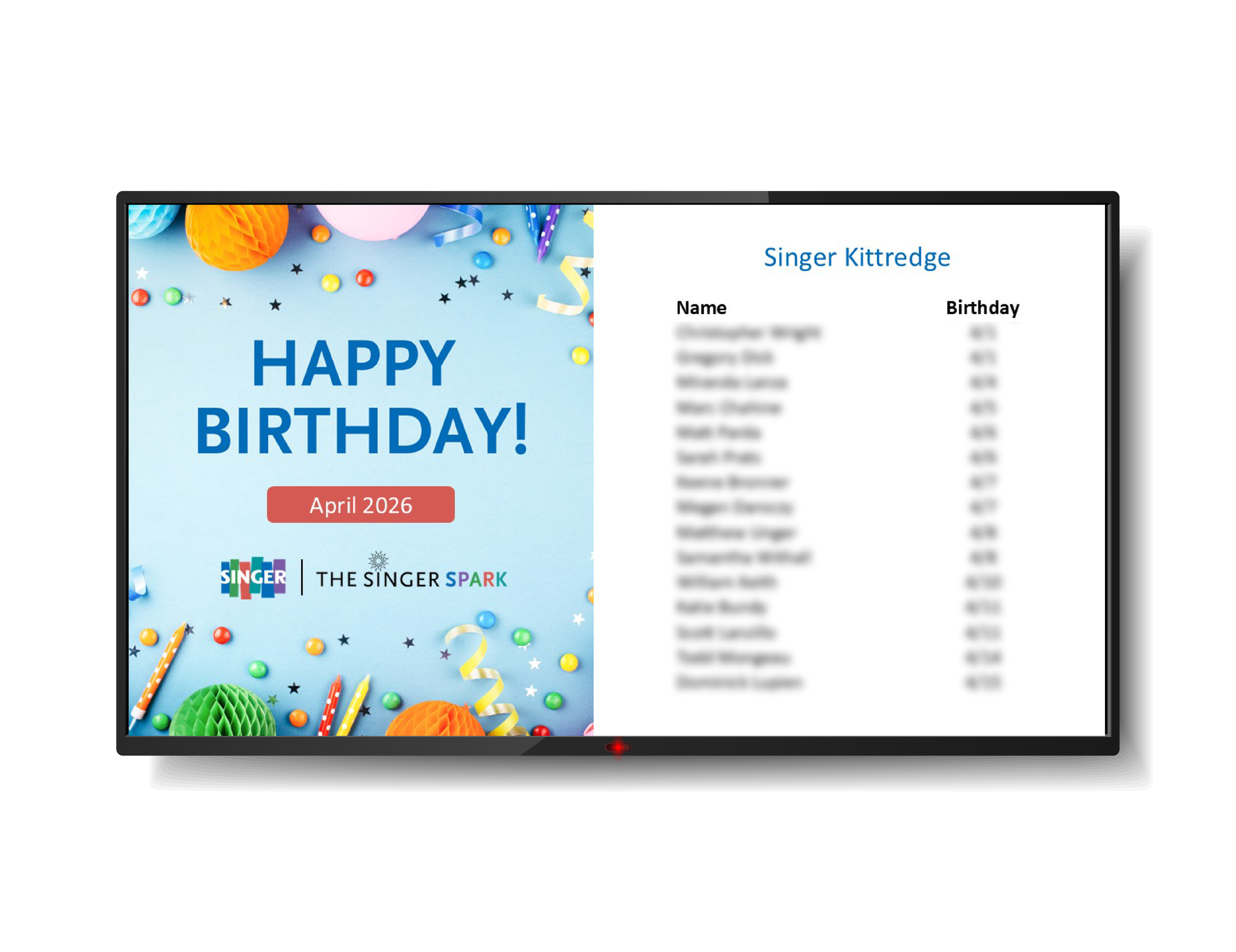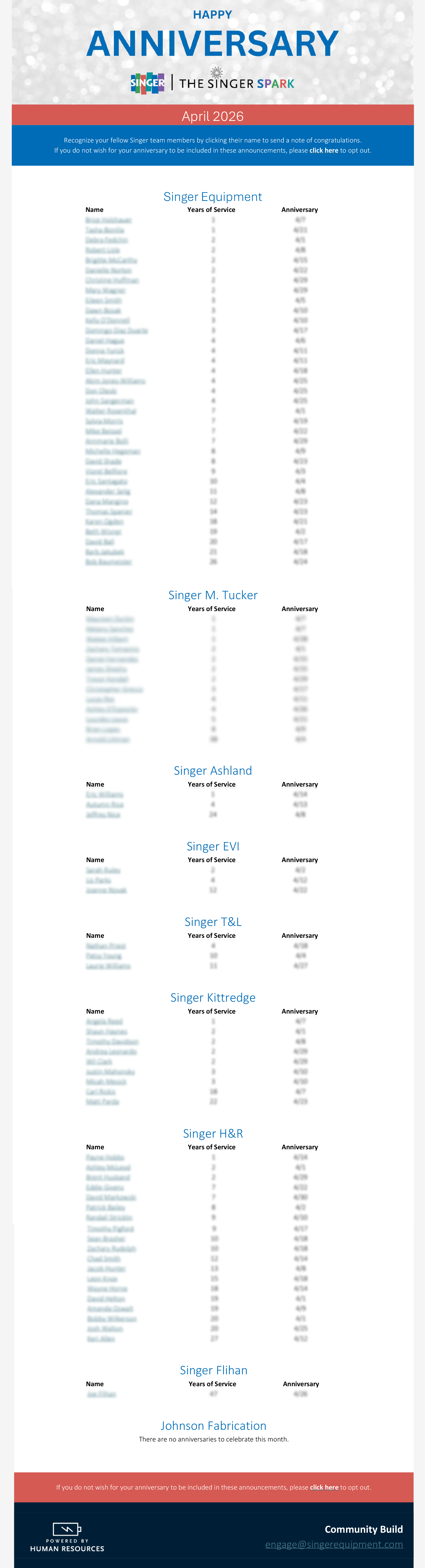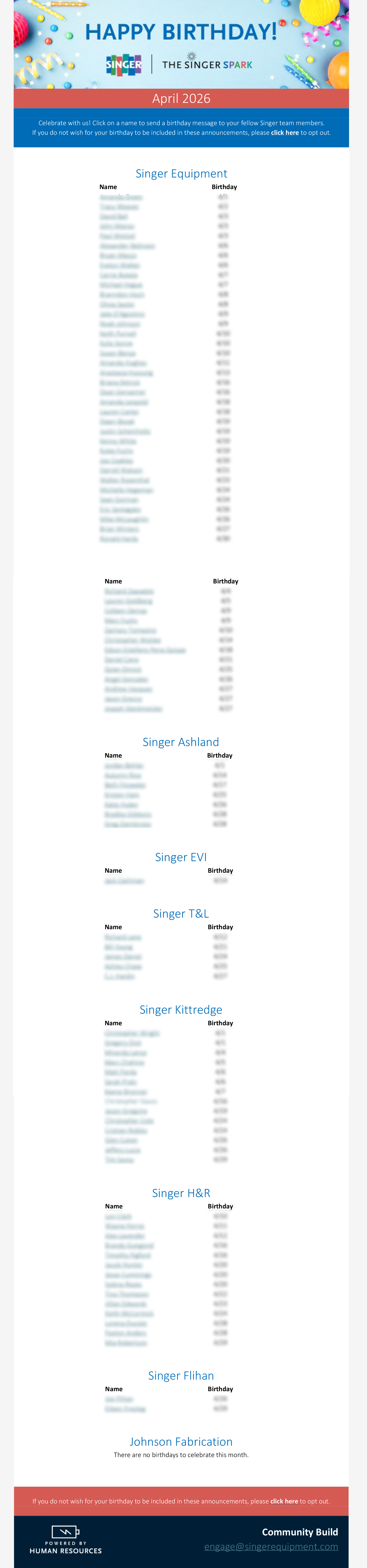 I created new email and digital display templates for employee birthdays and anniversaries. Each month, I updated the templates, sent the emails, and changed the graphics used on the TVs across our locations.